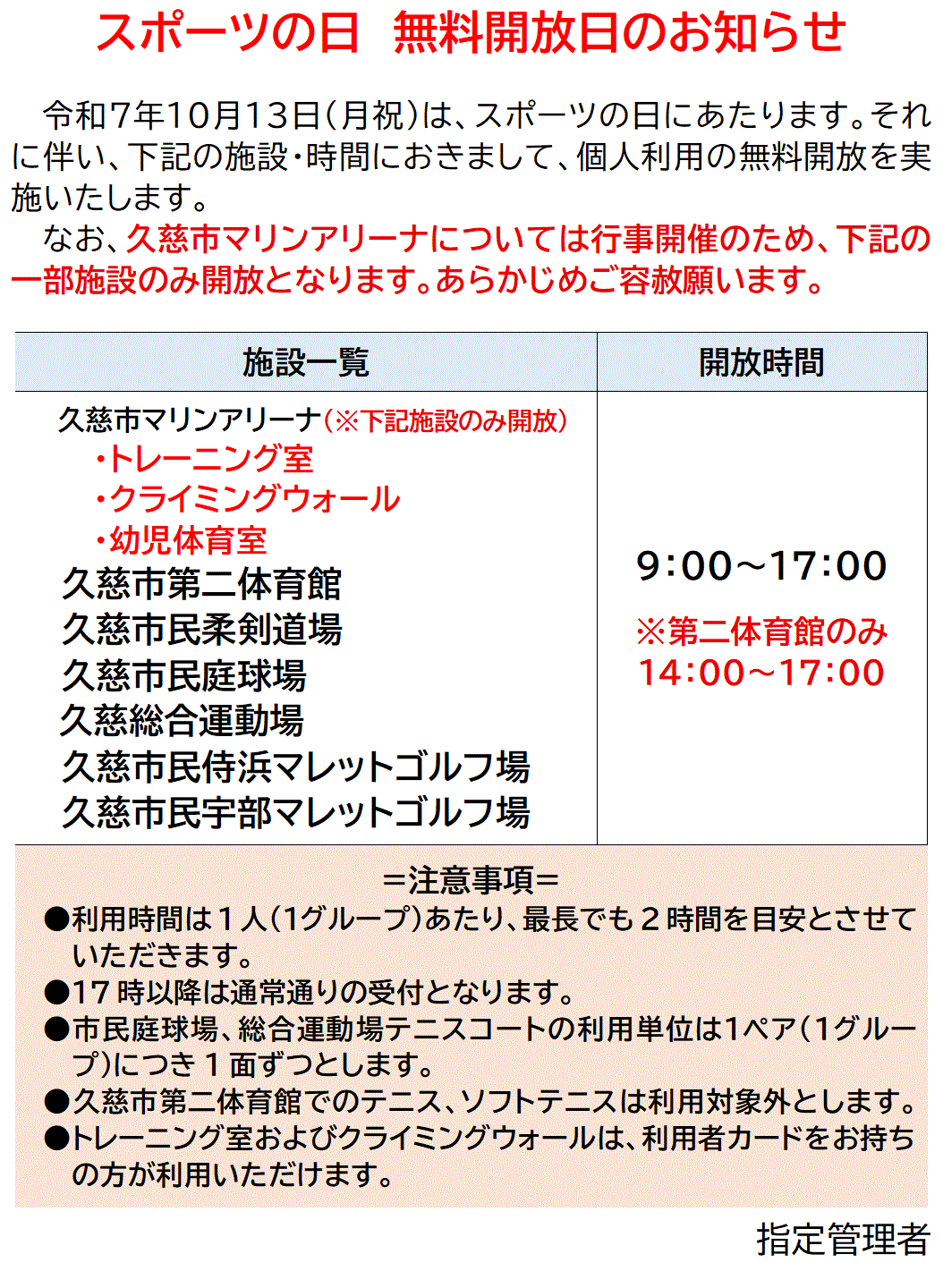 ![]() 利用者の皆様には大変ご不便をおかけしますが、ご理解の程、宜しくお願いいたします。 お問合せ:久慈市マリンアリーナ(久慈市民体育館) TEL 0194-61-3353 |