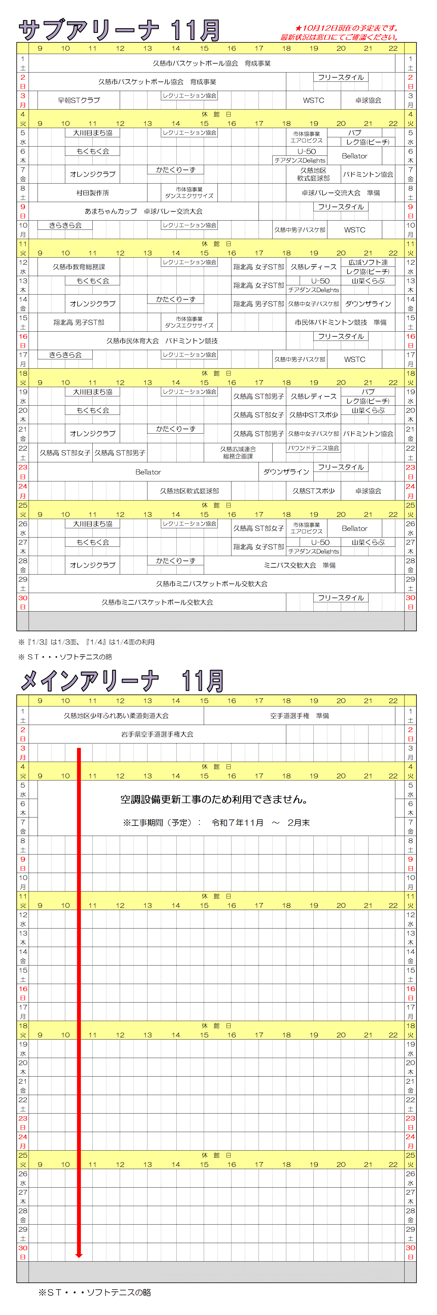 令和7年11月 久慈市マリンアリーナ 月間予定表 |