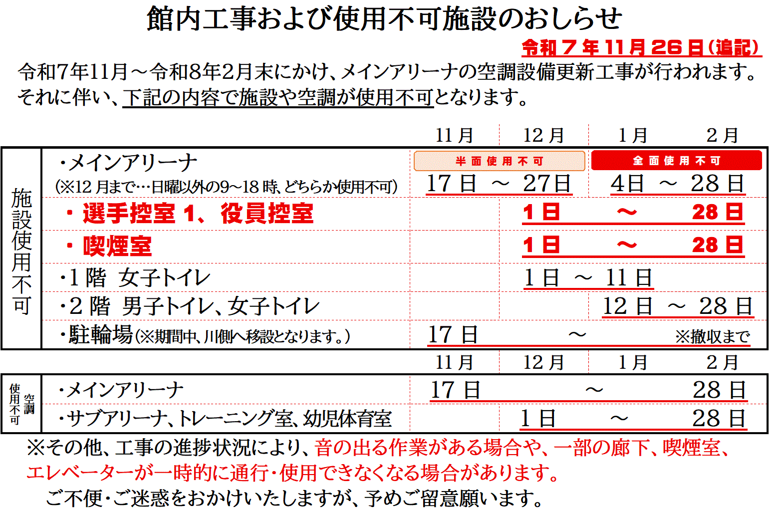 11月 市民体育館ランニングデッキ 利用不可予定 |