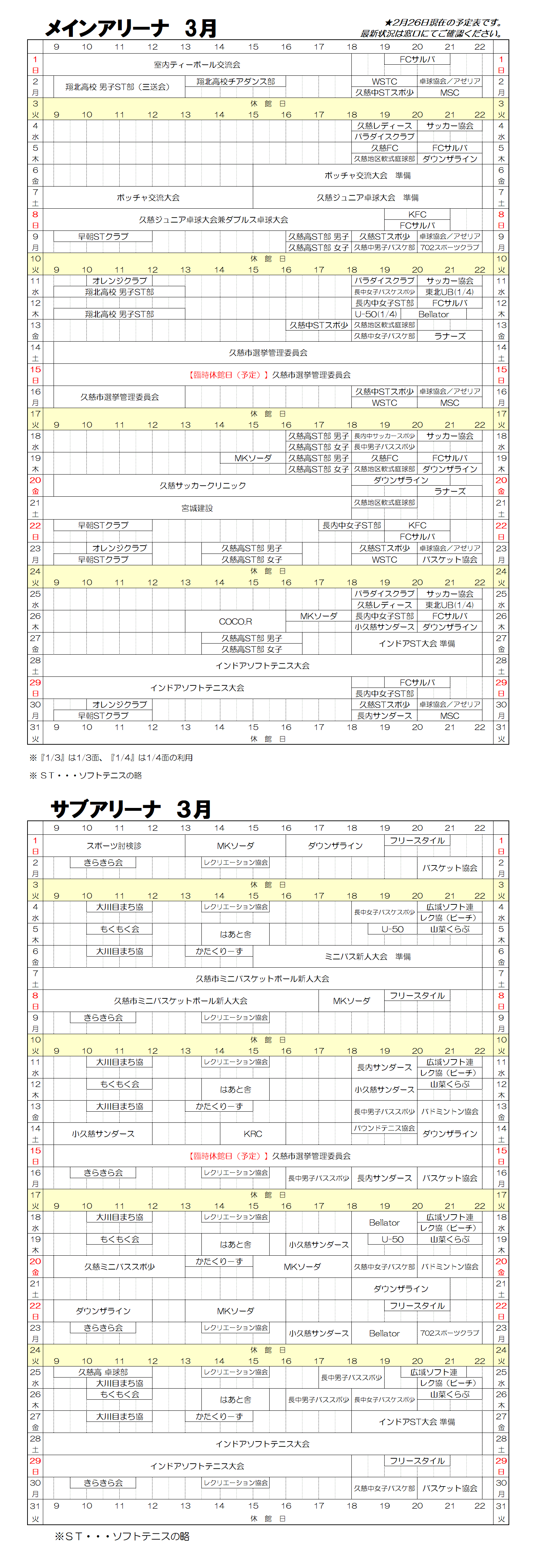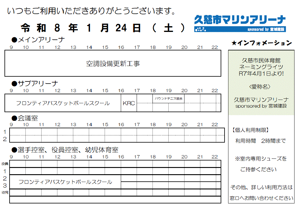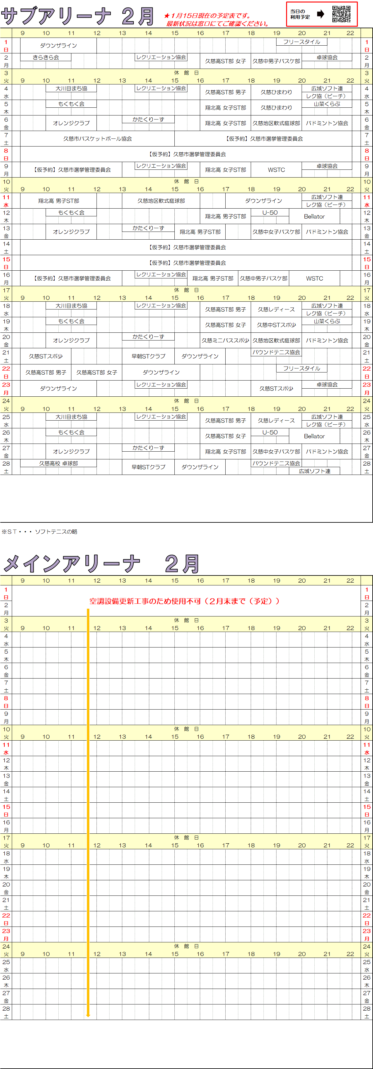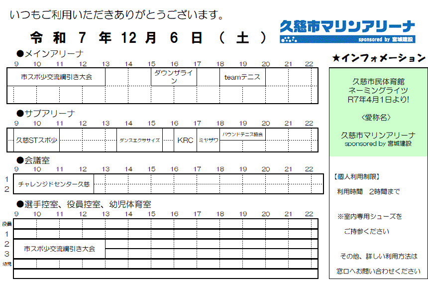 令和7年11月12日(水)現在の久慈市マリンアリーナ『メインアリーナ』・『サブアリーナ』予定表です。最新の予定は施設までお問合せください。 ◆久慈市マリンアリーナ(久慈市民体育館) п@0194-61-3353 火曜日休館日(火曜日が祝日の場合は翌日) | |