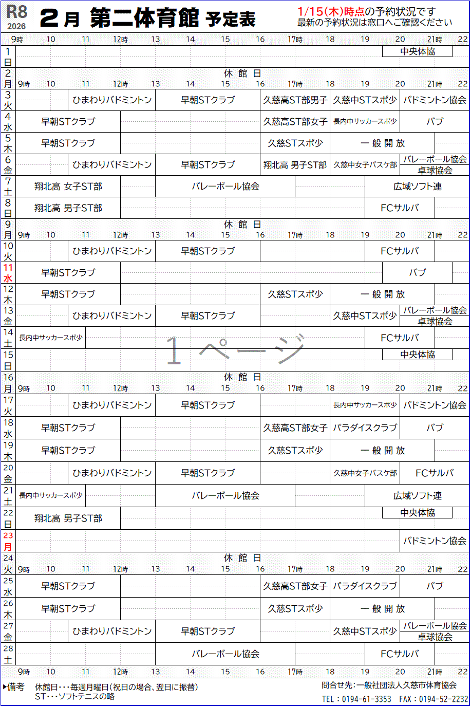 令和8年1月15日(木)現在の『久慈市第二体育館』の予定表です。最新の予定は施設までお問合せください。 ◆久慈市民柔剣道場(第二体育館) 0194-52-2869 月曜日休館日(月曜日が祝日の場合は翌日) | |