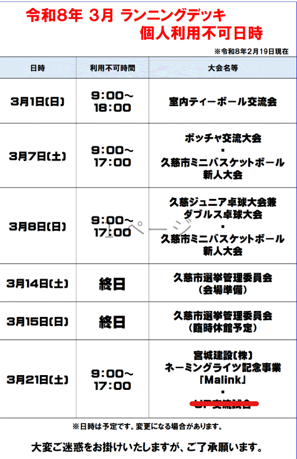 3月 市民体育館ランニングデッキ 利用不可予定 |