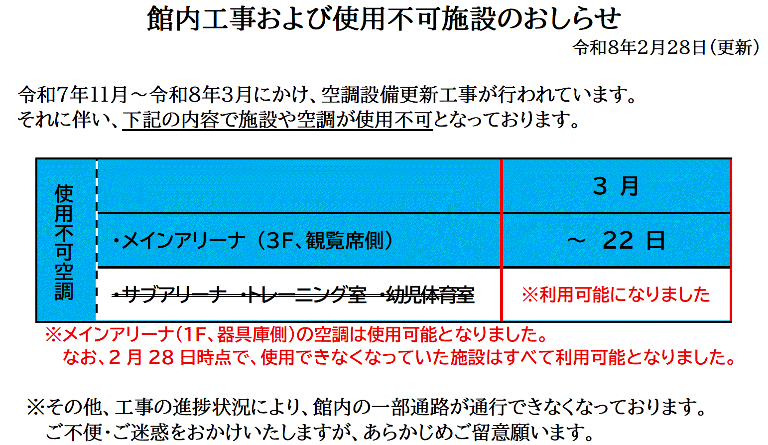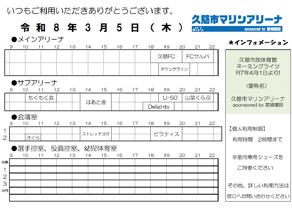 令和8年2月26日(木)現在の久慈市マリンアリーナの予定表です。最新の予定は施設までお問合せください。 ※空調設備更新工事のため、メインアリーナは2月末(予定)まで使用できません。 大変ご迷惑をお掛けいたしますがご了承願います | |