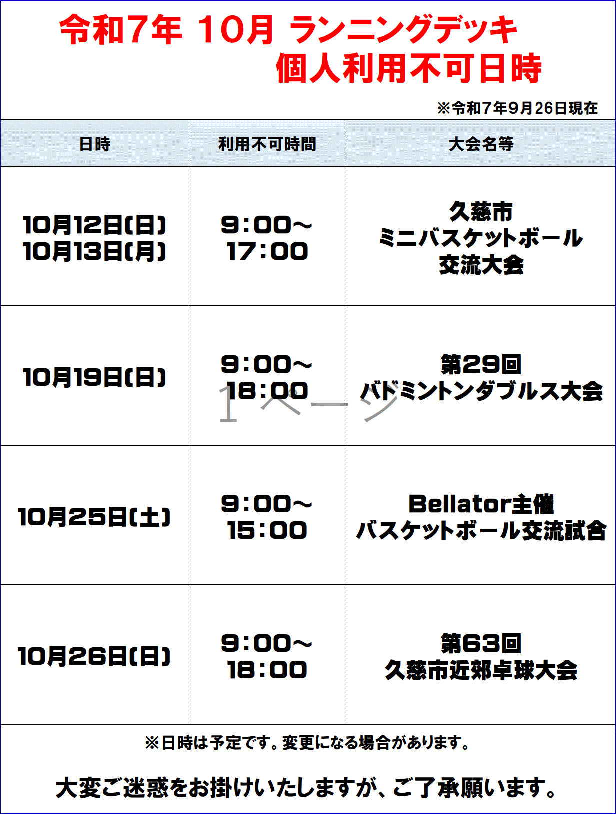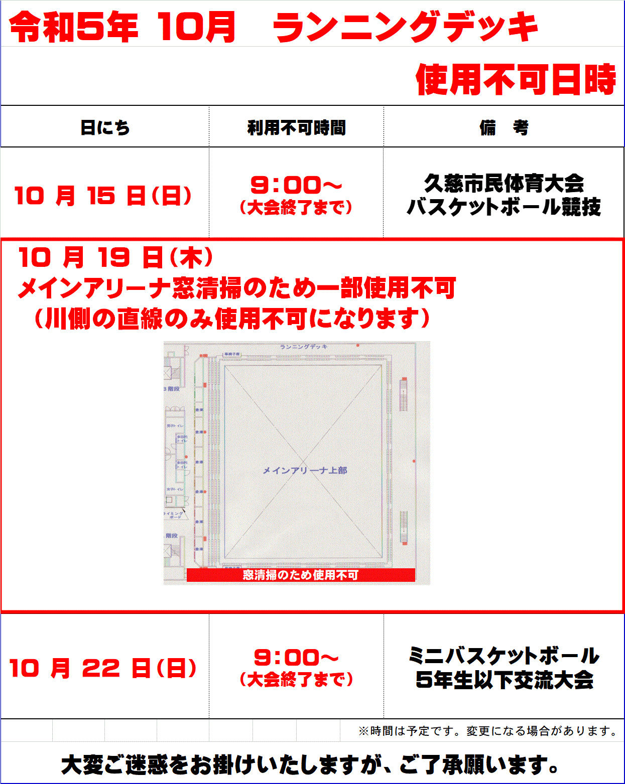 10月 市民体育館ランニングデッキ 利用不可予定 |