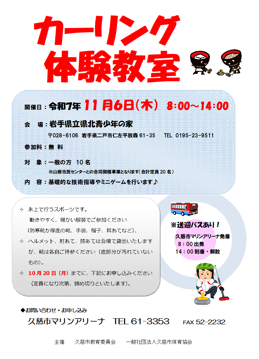 ![]() 最新の予定は施設までお問合せください。 ◆久慈市マリンアリーナ(久慈市民体育館) п@0194-61-3353 火曜日休館日(火曜日が祝日の場合は翌日) |